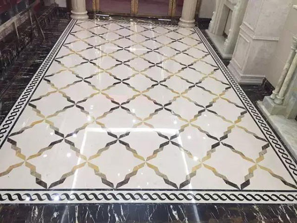 水刀拼花在現實裝修中較常見,美觀使用,主要在地磚中加以水刀拼花裝飾,顯得更加富麗堂皇。水刀拼花還不限制于瓷磚加工,大部分拼花廠品更是腦洞大開,有瓷磚與玻璃之間的組合,有瓷磚與金屬組合。