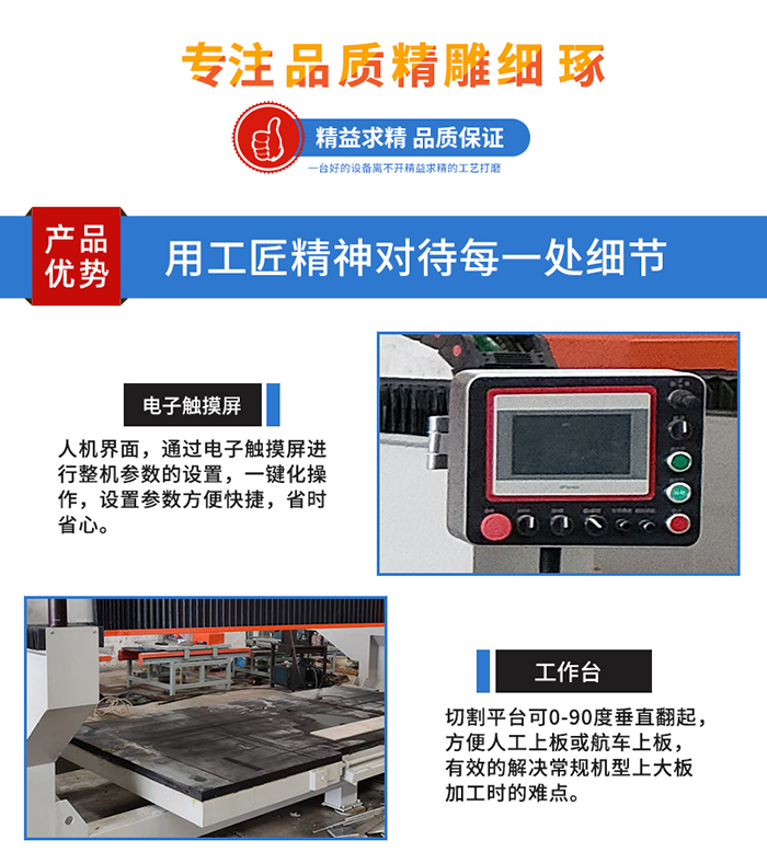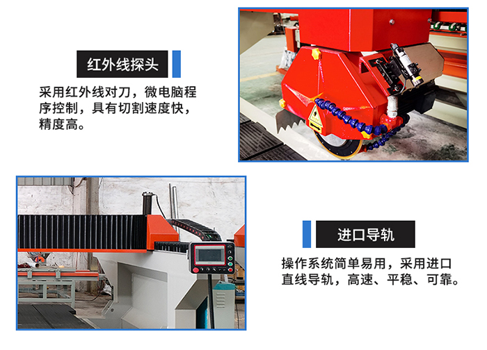 全自動350紅外線橋式切割機(jī)采用先進(jìn)精密的CNC數(shù)控龍門一體成型工藝,結(jié)構(gòu)穩(wěn)固耐用,整機(jī)的大梁及邊梁采用直線導(dǎo)軌,從而使設(shè)備切割更精準(zhǔn),靈活性更高,采用伺服PLC控制系統(tǒng),機(jī)頭90度兩邊自動倒角。機(jī)頭帶45度自動倒角,可四邊倒角,液壓傳動,穩(wěn)定流暢,全自動數(shù)控自動操作,加工簡單,速度快,精度高。直線、豎線、菱形任意角度切割,總體占地面積小于15㎡,整體裝車,現(xiàn)場安裝方便,適用于中小型石材深加工常用機(jī)械。
